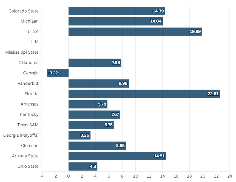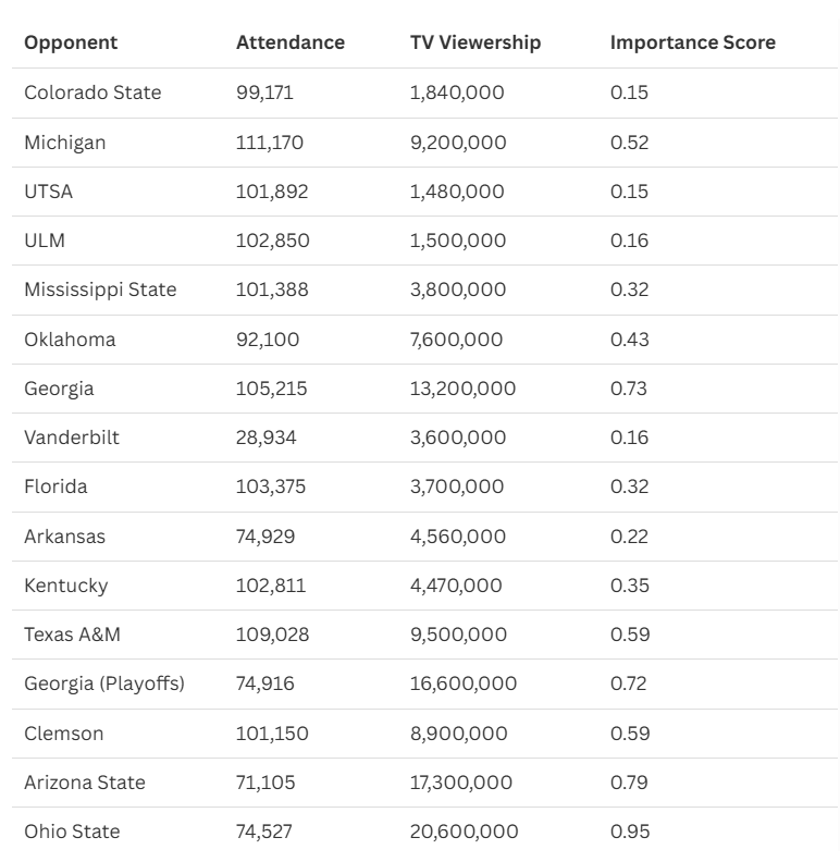 We now have a way to isolate and quantify the quality of a QB’s performance by game. However, not all games in college football are the same. Whether it is the strength of the opponent or the implications behind the game, every game has a different level of importance. The two most important factors in determining this is in-person attendance and TV viewership – this will account for conference and playoff factors (more people pay attention to more important games, which gains recognition for the program). For this purpose, I weighted the in person attendance and 20% and TV viewership at 80%.