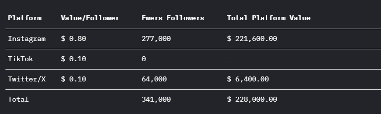In addition to calculating the performance value of a quarterback, we also have to consider the social exposure that a player brings to the team. One way to do this is to assign a marginal value to every social media follower on every platform: