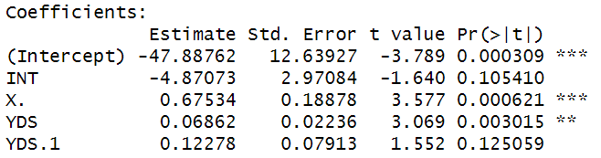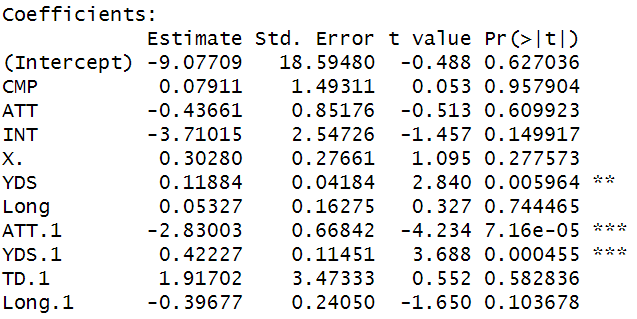 After going through the first pass of this process, we can see that many of the QB box score stats are not actually statistically relevant to the performance of the team. We can run the regression again after removing those variables: