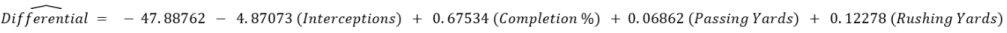 After this, we see that a reasonable equation to predict the team’s results based on the quarterback’s performance is: