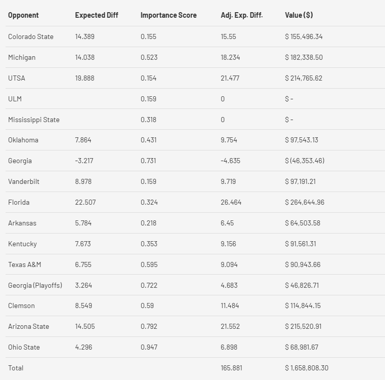 We can use this “importance score” as an exponential multiplier to the expected point differential (so that more important games have magnified performances). We also want to assign a dollar value to every point that the player generates, which in this case can be assumed as $10,000:
